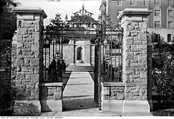 Alexander Muir Memorial Gardens was founded in 1933 but was originally located on the west side of Yonge Street across from Mount Pleasant Cemetery, where Muir is buried. Landscape architect Edwin Kay designed the original park using the maple leaf as a theme. The park was to celebrate Toronto's centennial in 1934 as well as to honour Muir. The park's creation was supported by public subscriptions.[1]
