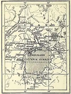 Mackay decided to become a missionary after Henry Morton Stanley was told by King Mutesa I of Buganda that Uganda needed missionaries, and who sent a latter to this effect to The Daily Telegraph in 1875 describing the need and asking for missionaries.[12][13] At the age of twenty-six, he subsequently joined the Church Missionary Society in 1876, which assigned him to serve in a missionary station in Uganda. Beginning on 27 April 1876, he sailed aboard the S.S. Peshawur from Southampton, England, and arrived on the island of Zanzibar on 30 May, some fifty miles off the east coast of Tanzania. At Mpwapwa they collected the necessary equipment, and made preliminary plans for their eight-hundred mile trek across Tanzania to the south end of Lake Victoria. On the journey Mackay came down with an acute case of fever and had to return to the coast, carried in a hammock most of the way back to Mpwapwa,[14] while the other members of the party continued on, making their way to the lake, where they put together a vessel, named Daisy, for crossing the lake north to Uganda. After Mackay recovered he organized a labor party and began outfitting a caravan of about seventy loads, and placed it in charge of an Englishman named Morton. In one-hundred days Mackay built a 230 mile wagon road to from Sadani on the coast to Mpwapwa, having to deal with many difficulties through the dense jungle and brush. After everyone had finally regrouped they crossed the lake.to Uganda, arriving there in November 1878.[15][16][17][18]