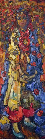From 1916 his style was post-Impressionistic and then neo-primitivist which derived partly from Russian sign painting. Initially Volkov was under the strong influence of Vrubel[5] and Roerich. Then he started painting in the same way as early Kandinsky. After moving to Uzbekistan, Volkov's works became marked by the influence of Matisse, Derain, Gauguin and Van Gogh. Then he went on to experimenting in the field of near-abstract art and became close in his manner to Tatlin and Malevich.