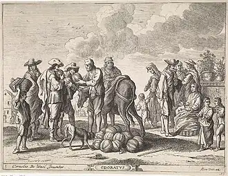 Alexander Voet was active as a reproductive artist who made prints after the works of contemporary Antwerp masters such as Rubens, van Dyck, Erasmus Quellinus the Younger, Cornelis de Vos and others. An example is the Card Players, an engraving after Cornelis de Vos' original which is now in the Nationalmuseum in Stockholm. Stylistically this print is very close to the engraving style of Paulus Pontius in its sharpness.[2] He further published and may also have engraved some plates of two series of prints after designs by Cornelis de Wael, one on the five senses and one on the four seasons. Melchior Hamers and Willem Peeters were the principal engravers for these sets.[6][7]