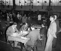 ![]() Beni (dark suit, right side of the table) vs. David Bronstein (1954) | |