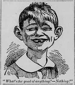 An older "archetype" was discovered in an advertisement for the comical stage play The New Boy, which debuted on Broadway in 1894. The image is nearly identical to that which appears in the Atmore's ads.[4] A description of the stage play's advertisement was published in the October 31, 1894, Hartford Courant, using words that could easily be describing the character of Alfred E. Neuman. The paper reported that the "comic red-headed urchin with a joyous grin all over his freckled face, whose phiz [face] is the trademark of the comedy, is so expressive of the rollicking and ridiculous that the 'New York Herald' and the 'Evening Telegram' have applied it to political cartoon purposes."[5] Elements of the plot of the play explain why the character has adult and childlike features, why the character is dressed as he is, and how he may have lost his teeth.[4] The original New Boy image was published with a two-part phrase that is similar in tone to Neuman's, "What? Me Worry?" catch phrase: "What's the good of anything? – Nothing!"[4]