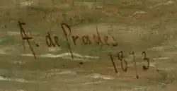 Unmarried, Frank de Prades moved his lodgings around the Covent Garden area of London, but traveled a considerable amount as most of his paintings were commissions from the nobility to paint themselves and their horses, as well as military men who wanted to be painted on the field of their glory. Frank died suddenly as a result of a fall from a hansom cab, fracturing his skull, 7 July 1885 at the age of 60 outside his home in London at 8 Southampton Street,[7] and is buried with his younger brother Henri and sister in law, Annie Boles de Prades in Kensal Green Cemetery,[8] London.