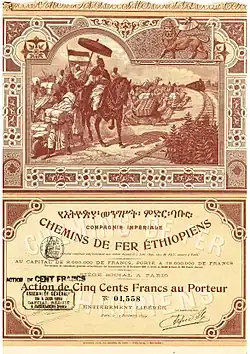 Menelik II rewarded Ilg with the title counselor in the range of an excellency in 1897 and, furthermore, named him minister of foreign affairs for the years 1897 to 1907. He showed his competence as an engineer when planning and implementing the railway line from Djibouti to the capital. He was also responsible for supervising the design and construction of the first piped water supply to the capital and for installing electrical power in the imperial palace in 1905.[5] Ilg was leading in the construction of several public buildings and worked as chef de protocole and secretary for the emperor, receiving the highest medal available, the Star of Ethiopia.