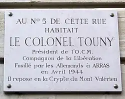 Touny's body was found and identified in January 1945, and returned to Paris on 11 November 1945, where he was chosen to represent the men of the Resistance who had been killed by the enemy, among 15 French heroes taken solemnly to the Dôme des Invalides in Paris, then to the Arc de Triomphe, before being buried at Fort Mont-Valérien.[1] His body is now entombed in the crypt of the Mémorial de la France combattante at Mont-Valérien.[5]