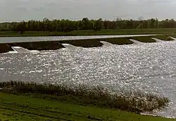 Immediately to the south, where the artificially constructed conduit of the river Hase flows into the Alfsee lakes, there is a small auxiliary basin (Absetzbecken) in front of the actual reservoir, from which water flows into the lake via a roughly 330 m long overflow dam.