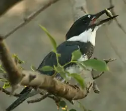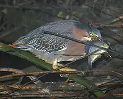 In 2006, a male and female California golden beaver arrived in Alhambra Creek in downtown Martinez.[6] The beavers built a dam 30 feet (9 m) wide and at one time 6 feet (2 m) high, and chewed through half the willows and other creekside landscaping the city planted as part of its US$9.7 million 1999 flood-improvement project. The City Council wanted to remove the beavers because of fears of flooding, ironically, as the worst flood since the flood control project was in 2005, two years before the beavers came. Local residents organized to protect them, forming an organization called Worth a Dam.[7] Resolution included installing a flow device pipe through the beaver dam so that the pond's water level could not become excessive. Now protected, the beaver have transformed Alhambra Creek from a trickle into multiple dams and beaver ponds, which in turn, led to the return of numerous birds, steelhead trout (Oncorhynchus mykiss) and river otter (Lontra canadensis) in 2008, and mink (Neogale vison) in 2009.[8][9] Examples of the impact of the beaver as a keystone species in 2010, include a green heron (Butorides virescens) catching a Sacramento splittail (Pogonichthys macrolepidotus), the first recorded sighting of the splittail fish in Alhambra Creek and the December arrival of a pair of hooded mergansers (Lophodytes cucullatus) (see photos). The beaver parents have produced babies every year since their 2006 arrival.[10] However, in June, 2010, after birthing and successfully weaning triplets this year (and quadruplets the previous three years), "Mom Beaver" died of natural causes.[11]