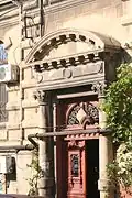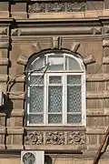 The main volumetric elements of the building define the portal of the main entrance and the balcony-shushebend (glazed veranda) on the second floor. The entrance's portal consists of a two-column composition of the Corinthian order with the corresponding elements of a plastic nature. The entrance is directly emphasized by a semicircular arch, double-leaf door leaves. On the facade, the portal convincingly enters and actively participates in shaping the volumetric system of the stone plastics. The preservation of the edifices aesthetic value is largely facilitated by the architectural details, the so-called elements of the second order.[2]