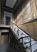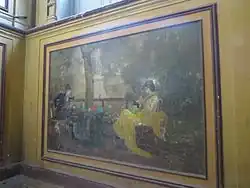 The interior space of the residential building is especially saturated with artistically executed interiors including the vast lobby of the two-story staircase outside the front rooms, ornamented with decorative panels with landscapes and genre scenes made by the architects-designers and painters who worked here. From the mezzanine, a wide glazed corner gallery leads to all the ceremonial rooms.[2]