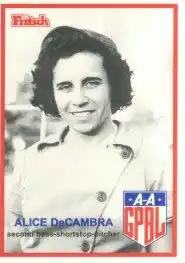 Alice DeCambra was a versatile player during her five years in the All-American Girls Professional Baseball League. She provided a solid defense at second base, juggling positions on the field as a pitcher and at shortstop. In 1948 she tied with Kenosha Comets' Elizabeth Fabac for the best fielding average at second base (.963). She was also a smart baserunner, averaging at least 21 stolen bases per season while collecting a .198 average and a .263 on-base percentage.[2]