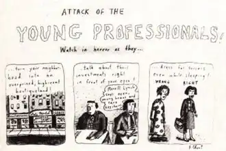 In early 1983, Kahn began writing an article about young urban professionals named Dirk and Brie, a satirical faux-sociological study. She coined the word "yuppie" for the article, basing it on the word "yups" appearing in the Chicago Reader, and on a New Yorker magazine cartoon by Roz Chast titled "Attack of the Young Professionals!", published in April 1983. She was unaware the word yuppie had been used earlier.[2] She published her satirical piece in the East Bay Express on June 10, 1983, about ten weeks after Bob Greene put the word in his Chicago Tribune column on March 23.[14] Kahn's piece was a more thorough description, more definitive, and after it was reprinted by other publications, it served to popularize the term to a greater degree.[4][2]