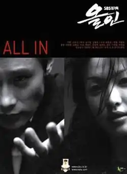 All In (Korean: 올인; RR: Orin) is a 2003 South Korean television drama series that aired on SBS TV from 15 January to 3 April 2003, on Wednesdays and Thursdays at 21:55 (KST) for 24 episodes.[1] Inspired by the life of professional poker player Jimmy Cha, it starred Lee Byung-hun and Song Hye-kyo in a story about one's man's rise through the fiercely competitive world of casino gambling as he clashes with his rivals over money, success, and love.[2]