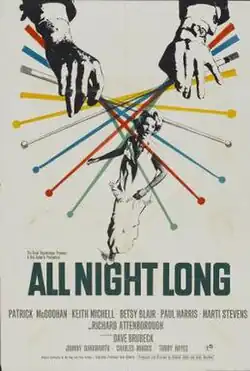All Night Long (also known as Night People) is a 1962 British neo noir drama film directed by Basil Dearden and starring Patrick McGoohan, Keith Michell, Betsy Blair, Paul Harris, Marti Stevens, and Richard Attenborough.[1] The story by Nel King and Paul Jarrico (who wrote under the pseudonym "Peter Achilles") is an updated version of William Shakespeare's Othello, set in the London jazz scene of the 1960s. The action takes place in a single evening, during an anniversary party. The black-and-white film features performances by several prominent British jazz musicians – among them John Dankworth and Tubby Hayes – as well as the Americans Dave Brubeck and Charles Mingus, who were in the UK in 1961 when filming took place and were recruited to participate.[2]