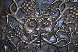 Inside the church, the arcades are carried on plain octagonal columns.[1] The pulpit is Jacobean with carvings of heads of angels which Richards considers to be possibly the most elaborate of their kind in the county.[10] It also includes a carving similar to the griffin in Alice's Adventures.[5] The font dates from the 19th century and was the gift of Miss Elizabeth Wood. Its elaborate wooden cover was given by Lady Greenall. There is a green man carved in the re-used Jacobean rood screen behind the altar.[5] The oak bench ends are carved with "inventive tracery-work".[13] In the belfry is a board with an acrostic on the name "Daresbury".[14]