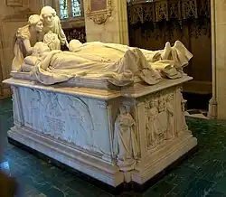 In the church are 35 monuments to the Curzon family; these include free-standing tombs, wall monuments and floor tablets.[6] They date from the 13th to the 20th centuries.[2] The largest is a free-standing tomb in the Kedleston Chapel. It bears the effigies of the 1st Marquess Curzon of Kedleston, who died in 1925, and his first wife Mary, for whom the chapel was built and who died in 1906 at the age of 36. It is a table tomb in white marble; two angels holding the crown of life lean over the effigies.[6] The memorial was designed by Sir Bertram Mackennal.[2]