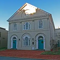 As the population of Frederick grew in the late-18th and early-19th centuries, the need for a larger, more accessible church led the vestry of All Saints Parish to call for the construction of a new building on a lot purchased from Dr. Philip Thomas and Richard Potts on Court Street. The vestry raised subscriptions and held a lottery to obtain the funds to build the new church which was completed in 1814.[8] Designed by Henry McCleery, the second All Saints' Church is an example of Federal design with Palladian influences. The first floor doors and window display a unique inter-woven design carved into their architraves. The second-floor windows are separated by stuccoed pilasters and a fanlight is centered in the pediment above. This new building was consecrated by Bishop Claggett on November 12, 1814.
