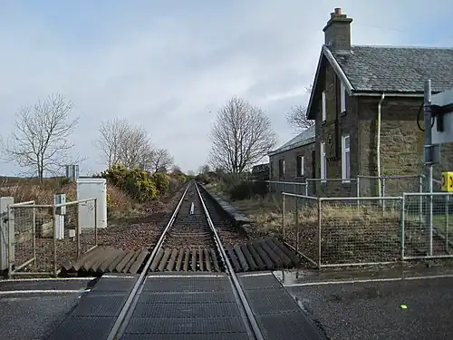 The closed station buildings survive (next to an automatic half-barrier level crossing) and are now occupied.[5] They are passed by trains on the single track Aberdeen to Inverness Line. Remains of a platform can also be seen.