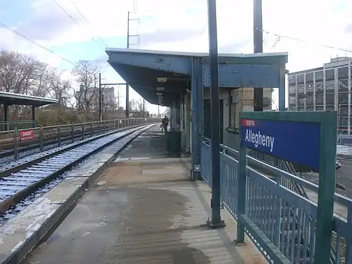 Allegheny station is a SEPTA Regional Rail station located along the Manayunk/Norristown Line located at 22nd Street and Allegheny Avenue in the Swampoodle neighborhood of North Philadelphia.[3] It has also been known in Reading and early SEPTA timetables as 22nd Street or Twenty-Second Street, a name also shared by a former Pennsylvania Railroad station on the Trenton and Chestnut Hill lines. Allegheny station is the first station along SEPTA's Manayunk/Norristown Line not to be shared with any other line. In FY 2013, Allegheny station had a weekday average of 76 boardings and 102 alightings.[4]