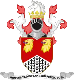 | Arms | Per chevron Gules and Ermine in chief two Lion's Heads erased Or |
