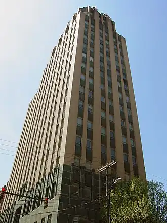 Construction of the building began in 1929 and was completed in 1931, and it was designed by Stanhope S. Johnson and Addison Staples. The 17-story, 40-foot (12 m) by 132-foot (40 m) building was the tallest building in Lynchburg until completion of the Bank of the James Building in 1972. It is steel framed and faced in yellow brick and greenstone in Art Deco style.[4] Its outer shape and design is very similar to that of the Central National Bank in Richmond, Virginia.