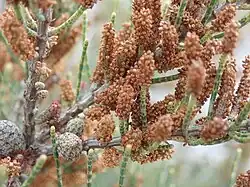 Allocasuarina humilis is an erect or spreading, dioecious or monoecious shrub that typically grows to a height of 0.2–2 m (7.9 in – 6 ft 6.7 in). Its needle-like branchlets are more or less erect, up to 120 mm (4.7 in) long, the leaves reduced to scale-like teeth 0.4–0.5 mm (0.016–0.020 in) long, arranged in whorls of five to seven around the branchlets. The branchlets are smooth and sometimes waxy. The sections of branchlet between the leaf whorls (the "articles") are mostly 3–6 mm (0.12–0.24 in) long and 0.8–1.2 mm (0.031–0.047 in) wide. Male flowers are arranged in spikes 6–18 mm (0.24–0.71 in) long, in whorls of 12 to 16 per centimetre (per 0.39 in.), the anthers 0.7–0.8 mm (0.028–0.031 in) long. Flowering occurs from May to November, and the mature cones are sessile, 12–22 mm (0.47–0.87 in) long and 10–17 mm (0.39–0.67 in) in diameter containing samaras 5–6 mm (0.20–0.24 in) long with a short wing.[2][3][4]