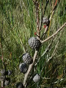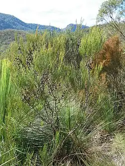 This she-oak grows on serpentinite rocks in tall heath and low woodland on the southern end of the Northern Tablelands and nearby coastal ranges in eastern New South Wales.[2][3][4]