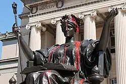 More recently, The New York Times has dubbed Alma Mater the "grand old lady" of Columbia University, who "reigns in queenly splendor in front of Low Library."[25] The AIA Guide to New York City described it as "an evocative statue" where "the enthroned figure extends her hand in welcome as she looks up from the mighty tome of knowledge lying open in her lap."[26] Alma Mater's placement in front of Low Library in particular has been praised for its role in welcoming students to the university and highlighting the university's relationship with the city of New York. As Professor of Historic Preservation Andrew Dolkart notes:
