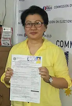 ![]() 2nd District of Samar Board Member Alma Uy-Lampasa during the filing of her Certificate of Candidacy (COC) for 2016 national election in COMELEC | |