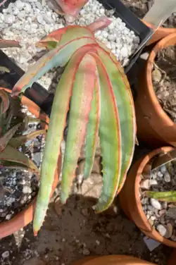This is a cliff dwelling species, which means it hangs down from cliffs. Plants have leaves that when young, are stacked, and plants can clump. When mature, forms rosettes. When sun stressed, leaves may turn turn a peach on the areas exposed to sun, but will not be even due to its cliff dwelling nature. Leaves are serrated like most other aloe species.[2]