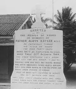 Alois Kayser (March 29, 1877 in Lupstein, Alsace – October 21, 1944 in Chuuk) was a German-French Roman Catholic missionary who spent almost forty years on Nauru and wrote a Nauruan grammar (and possibly a Nauruan language dictionary). In 1943, he was deported along with Pierre Clivaz, a Swiss missionary, as well as most of the Nauruan population, by the Japanese to Truk Atoll in Micronesia, where he died.