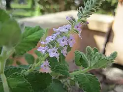 These plants are subshrubs, shrubs, or trees growing 0.5 meters to 15 meters tall.[3] Many are very aromatic.[4] The stems may be four-angled and smooth when new, becoming more angular or rounded and often furrowed or striated with age. The leaves are evergreen or deciduous in the dry season. They are often oppositely arranged or whorled, but can be alternate or clustered. The blades are variable in shape, toothed or smooth-edged, and hairless to rough-haired on the upper surfaces. The undersides may have glandular hairs. The inflorescence is usually a raceme of widely spaced clusters of 3 to 6 flowers each. There are leaflike bracts under the flowers which can be showy in some species. The calyx of sepals has 2 or 4 lobes and is persistent, enclosing the fruit as it develops. The flower corolla is tubular with a wider mouth divided into four lobes, one of which may be cleft. The corolla can be white, purplish, blue, or pink. The narrow style is tipped with a bilobed stigma and there are 4 stamens. The fruit is a schizocarp.[3]