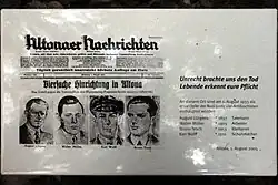 In the first trial, from 8 May to 2 June 1933, four of the defendants, Bruno Tesch, Walter Möller, Karl Wolff, and August Lütgens, who were classified as Communists, were sentenced to death by the Special Branch of the Altona District Court which had been set up by National Socialist judicial politicians.[10] The chairman of the Special Court in the trial was Johannes Block.[11] The sentence was carried out by beheading on 1 August 1933 in the courtyard of the building, now the Altona District Court. They were the first "politically-willed" executions in the Third Reich.[12] The other eleven defendants were sentenced to prison terms, some of them for many years, including Emil Wendt, who was sentenced to 10 years.[13] After serving his term, he was taken to the Waldheim Prison in Saxony, where he was murdered on 26 October 1944. A total of six trials related to Altona Bloody Sunday took place through 1935.