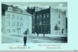 By 1487 the school had moved to the street Danziger Keller near Königsberg Castle.[4] The parochial school was expanded into a Latin school in 1525 during the Protestant Reformation. Because sunlight at the Danziger Keller building was partially blocked by one of the castle's towers, Altstadt's council approved the construction of a replacement school at Altstädtischer Kirchplatz (the later Kaiser-Wilhelm-Platz). The new school was built from 1592 to 1595 and dedicated on 14 August 1595.[4] It hosted the Königsberg Public Library from 1737 to 1773.