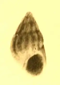 The length of the shell attains 3¼ mm, its diameter 2 mm.