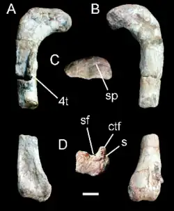 In 2005, Rauhut and Remes found Alwalkeria to be a chimera, with the anterior skull referable to a crurotarsan, and the vertebrae referable to various other ancient reptiles including Prolacertiformes; the femur and the astragalus are clearly dinosaurian, however, with the latter possessing saurischian characteristics.[3] In 2011, Novas and colleagues argued that Alwalkeria remains valid on the basis of an unusual morphology of its femur and an astragalus with a conservative morphology more similar to that of basal dinosaurs.[4] In 2016, Lecuona, Ezcurra & Irmis reiterated the chimaeric nature of the Alwalkeria holotype, noting that the skull material could be referred to the Crocodylomorpha. They also observed that the distal femur was more consistent with the morphology of pseudosuchians, leading them to identify this bone fragment as an indeterminate representative of that clade. The vertebrae lack anatomical features allowing for a precise identification, dinosaur, pseudosuchian, or otherwise.[5]