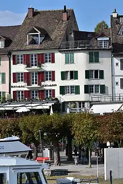 Gossauer's first own photo atelier "Photographie A. Gossauer", photographed by herself around 1880. The photograph shows the present Seequai in Rapperswil, where at that time the Zürichsee-Schifffahrtsgesellschaft (ZSG) landing gate was situated, Lindenhof hill and the Rapperswil Castle's Gügeli tower in the background.