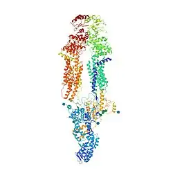 Presenilin 1 (PSEN1) is the catalytic subunit of the transmembrane protein complex gamma-secretase.[30][12] This protein cleaves amyloid precursor protein (APP), after beta-secretase cleavage, to produce Amyloid beta.[12][30] The gene for PSEN1 is located on chromosome 14, q24.2, and consists of 12 exons that encode a 467-amino-acid protein that is predicted to traverse the membrane 9 times.[12] Over 200 pathogenic mutations of this protein exist, many of which account for 18% to 50% of autosomal dominant EOAD cases.[16][12][31] PSEN1 mutations increase the risk of developing AD by increasing the production of amyloid beta-42, compared to amyloid beta-40.[12] Unlike APOE4, PSEN1 mutations tend to have a clear pathological effect in Hispanics and Latinos and tend to express region-specific mutations.[10] Puerto Ricans have a G206A mutation that causes familial AD, Cuban families diagnosed with EAOD commonly exhibit a L174M, mutation, Mexican families exhibit L171P and A431E mutations, and Colombian families exhibit an E280A mutation (particularly in the municipality of Yarumal).[10][32]