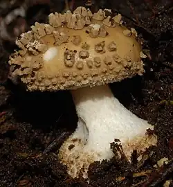 Amanita australis is a species of fungus in the family Amanitaceae. It produces small- to medium-sized fruit bodies, with brown caps up to 9 centimetres (3+12 inches) in diameter covered with pyramidal warts. The gills on the underside of the cap are white, closely crowded together, and free from attachment to the stem. The stem, up to 9 cm (3+12 in) long, has a ring and a bulbous base. The mushroom may be confused with another endemic New Zealand species, A. nothofagi, but can be distinguished by differences in microscopic characteristics.