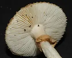 The gills are crowded closely together, free from attachment to the stem, 6–10 mm (1438 in) wide, and white. The lamellulae (short gills that do not extend fully from the cap edge to the stem) have truncated ends. The stem is 37–90 mm (1+123+12 in) tall, 6–26 mm (14–1 in) in diameter, and narrowest at center. It is hollow, and has an abruptly bulbous base that is between 14 and 38 mm (12 and 1+12 in) in diameter. The surface of the stem above the level of the ring is white and covered in woolly tufts of mycelia; below the ring it is white with buff to greyish transverse, grooved bands. The base may or may not have a rim of volval remnants that are powdery, and a greyish-buff to greyish-sepia colour. The ring is membranous, white to buff, first hanging freely then later adhering to the stem. The flesh of the cap is white, occasionally pale isabelline under the center of the cap; the flesh of the stem is white.[1]