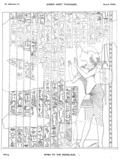 The inscription on the west wall of Amarna Tomb 3 is a prayer to the god Ra-Horakhty,[3] the combination of the gods Ra, the sun god, and Horus, the god of the sky and horizon. Like the “Hymn to the Setting Sun”, this inscription covers the creation of mankind and animals by the god Ra. This inscription is primarily concerned with the health and prosperity of Ahmose's “beloved son, Nefer-kheperu-ra”.[3] Ahmose prays for his son's wellbeing and success, calling on the god to “grant to him Sed festivals”, a celebration of Pharaonic rule and kingly power, “years of peace” and a “burial of his giving”.[3] Egyptologist Jan Assman stated that inscriptions of sun hymns in tombs became an established practice during the New Kingdom period.[19] He commented that the presentation of these hymns in burial contexts was a “fulfilment of a prescribed norm”,[19] not a reflection of individual religious piety. According to Assman, the sun hymns in the tomb of Ahmose are based upon a standard funerary text belonging to the cult of Aten.[19]