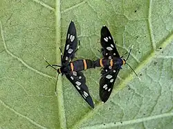 Amata bicincta is a moth in the genus Amata (or Syntomis) of the subfamily Arctiinae ("woolly bears" or "tiger moths"). The species was first described by Vincenz Kollar in 1844. It is also known as the nine-spotted moth and handmaiden moth. It is a common day-flying warningly colored moth. The adult is unpalatable to birds and other predators. It is found in the north-western Himalayas, Sikkim, Khasis, Pakistan and Bangladesh.[2]