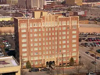 The hotel building currently has 55 guest rooms[4] and is located at the northwest corner of Main Street and 14th Street in Tulsa. It is included as a supporting item in the Riverview Historic District. Although the street address is given as 1324 South Main, the main entrance is actually on 14th Street, which runs along the south of the building. Constructed primarily of poured concrete columns and beams, it measures 120 feet (37 m) by 40 feet (12 m) in plan, It is 9 stories high and has a full basement. The ninth floor has a concrete slab ceiling. The building roof is flat and hidden from street view by a parapet. It was originally built on a wooden frame a few feet above the slab ceiling and was covered with asphalt. The frame was deteriorated beyond repair by 1999 and needed to be replaced. The replacement was to have a light steel frame.[5]