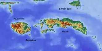 The island is of volcanic origin, and is composed of Cenozoic sedimentary rocks. The relief is mostly mountainous, with the highest points at 608 m (Mt. Baula) and 559 m (Mt. Nona) in the western area.[4] The island rises vertically from the sea, and flat parts are found only on the southern and eastern coasts. Much of the territory, especially in mountainous areas, is covered with wet tropical forests.[5] The island is located in a seismically active zone with frequent earthquakes; two significant recent earthquakes occurred in August 2006[6] and January 2016 when eight people were hurt and about 120 houses were damaged in two villages.[7] Flora and fauna of the island are diverse and are similar to that of Buru. There are abundant coral reefs off the coast of Ambelau.[5]