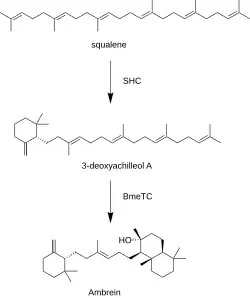 Ambrein is synthesized from the common triterpenoid precursor squalene. The squalene-hopene cyclase (SHC) catalyzes the cyclization of squalene into the monocyclic 3-deoxyachilleol A. Tetraprenyl-beta-curcumene synthase (BmeTC) converts 3-deoxyachilleol A into the tricyclic ambrein.[8]