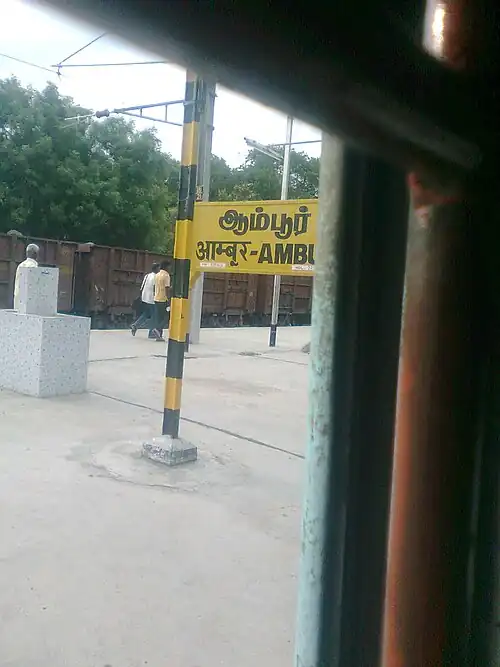 Ambur railway station (station code: AB) is an NSG–5 category Indian railway station in Chennai railway division of Southern Railway zone.[1] It is located in Ambur, Tirupattur district, Tamil Nadu.[2]
