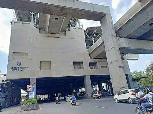 Ameerpet metro station is an interchange metro station between the Red Line and Blue Line of the Hyderabad Metro.[1][2] The Ameerpet Inter-change Metro Station is one of the largest metro stations in India with a sprawling premises over 200,000 square feet (19,000 m2).[3] Ameerpet metro station is one of the busiest metro stations in Hyderabad with daily footfalls of around 32,000 commuters.[4][5][6]