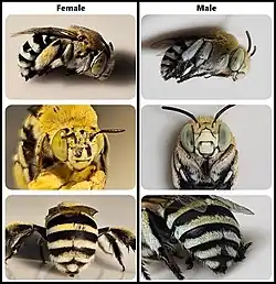The eyes are large and grey-green.[2] The antennae are black and the tongue is long.[2] The labrum, mandibles and supraclypeal areas are pale yellow.[1] The clypeus has a pale yellow upside-down T-shape, creating two black facial stripes that are much wider on the female.[1] The areas around the eyes are black, with predominantly pale yellow hair.[1]