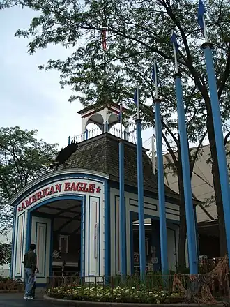 American Eagle is a wooden racing roller coaster located at Six Flags Great America theme park in Gurnee, Illinois. It was the first wooden roller coaster designed by Intamin of Switzerland and was built in 1981 by the contracting firm Figley-Wright at a cost of $10 million. While most of the records have since been broken, American Eagle had the longest drop and fastest speeds among wooden roller coasters when it debuted and is still recognized as a top racing coaster in the United States.