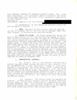 For the most part, players were assigned to teams on a regional basis to increase fan loyalty stemming from their college experiences. The Syracuse team was made up of mostly Syracuse University and Hobart College players; The Boston team made up of University of Massachusetts and Brown University players; the Baltimore team consisted of Johns Hopkins, University of North Carolina and Loyola University athletes; the Denver Rifles had players hailing from The University of Colorado, Colorado State University and Colorado College etc. Players were signed to uniform two-year contracts that paid $4,800 the first year and $6,000 in 1989. At that same time the MILL (the indoor league) was still paying its players $100 per game.[12] The first player officially signed by the league was Greg Fisk, an All-American Midfield hailing from the University of Massachusetts and signed to the Boston Militia.[13]