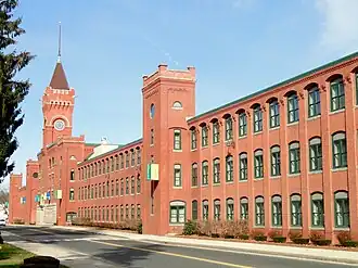 The American Optical Company was founded in Southbridge in 1869, by the merger of several other lens manufacturers whose origins in the town dated back to the 1830s. The company was at first located on East Main Street, but it soon relocated to Mechanic Street, where one of its largest surviving plant buildings still stands. Over the next century the company expanded greatly, occupying land on both sides of the Quinebaug River. By the early 20th century, it was the world's largest manufacturer of eyewear, with multiple manufacturing facilities and an international sales force. Although the company's independent existence ended in 1967, portions of its manufacturing facilities continue to be used by successors for glass-related manufacturing.[2]